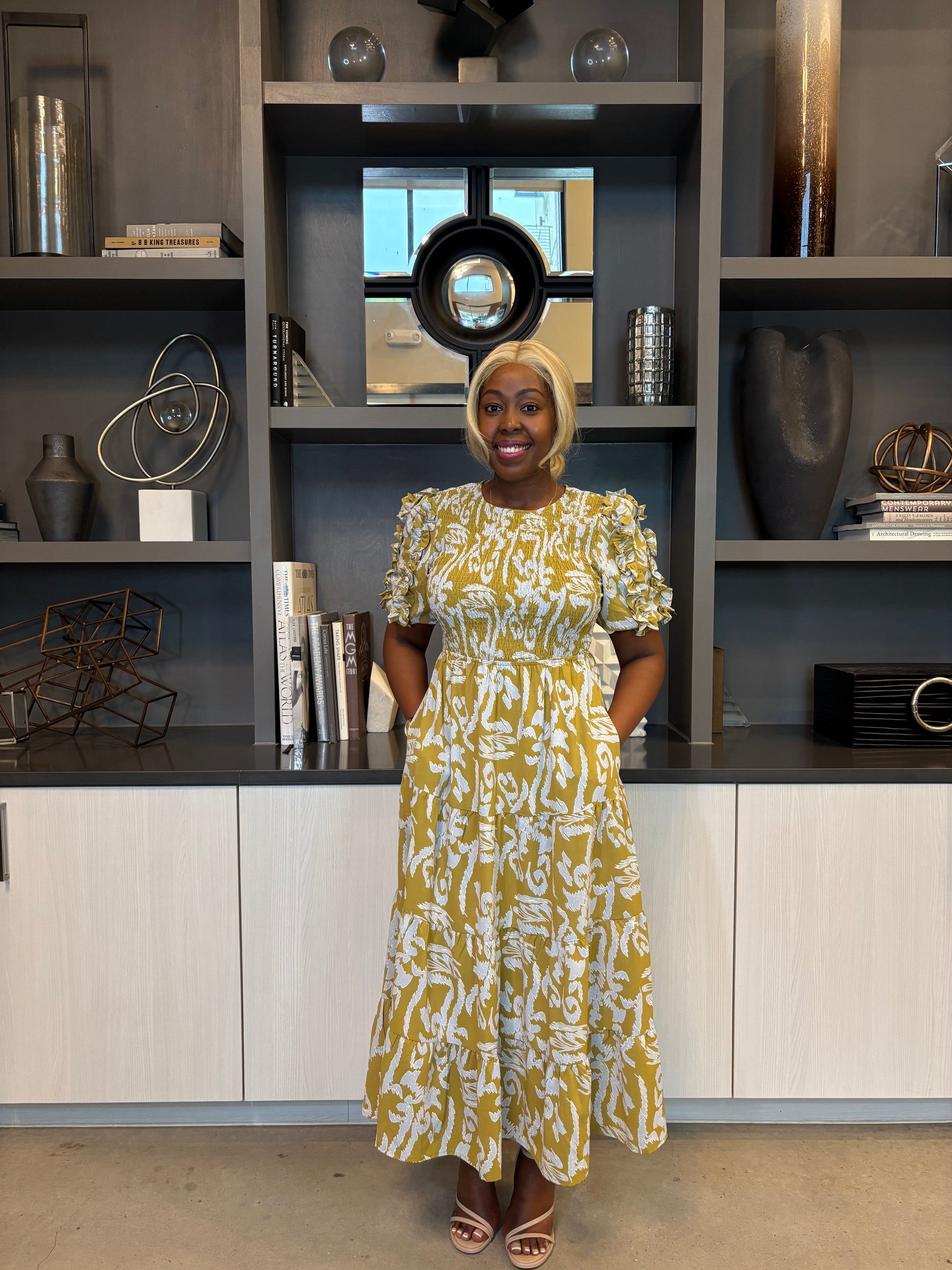 The Mediterranean Olive dress offers a beautiful pop of olive color in a flowy and modest design. With convenient pockets, this dress seamlessly combines style and comfort. Perfect for any occasion.