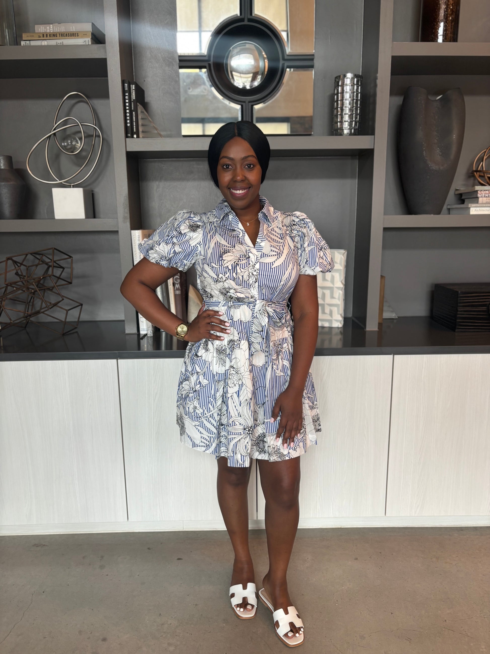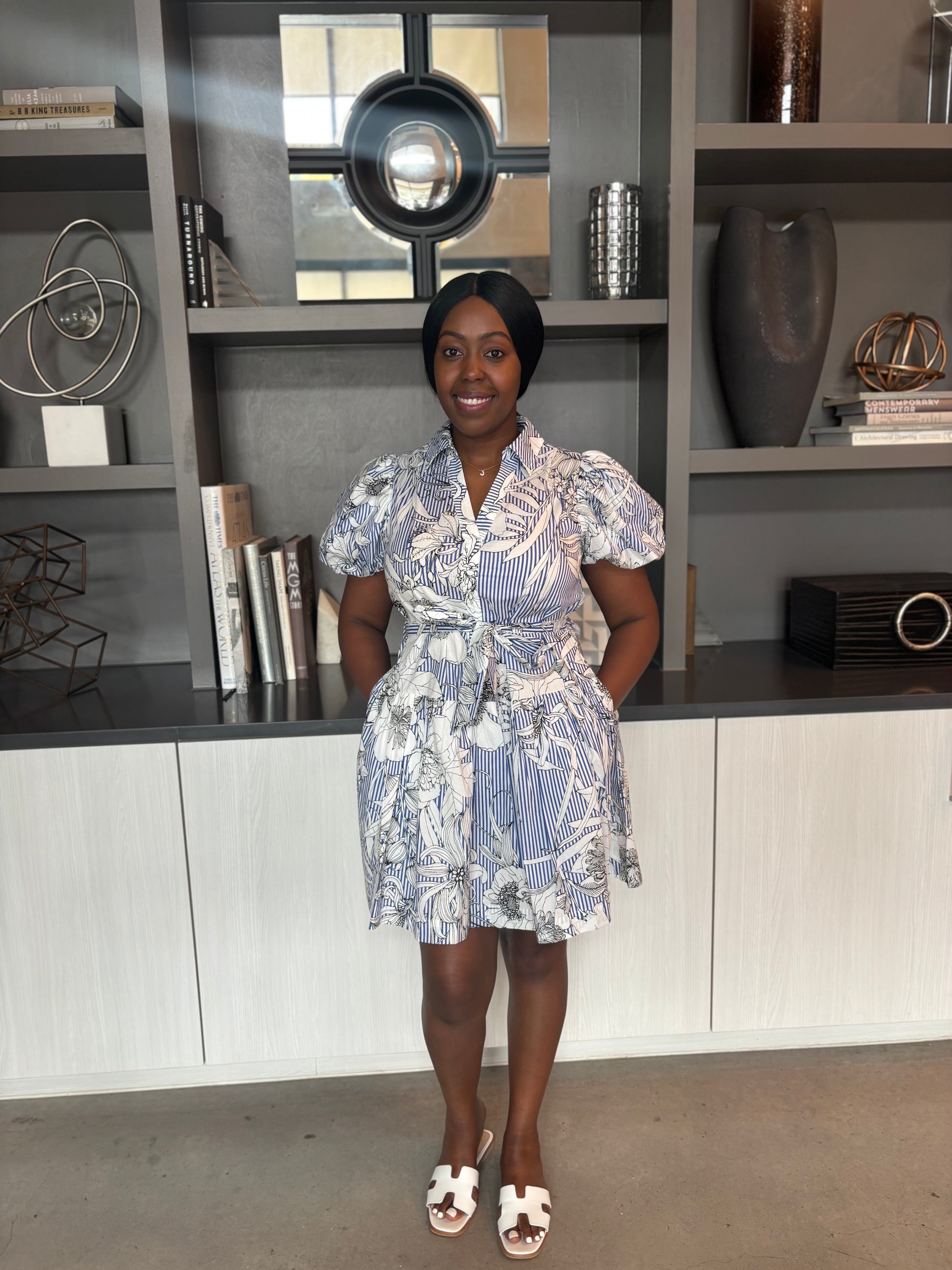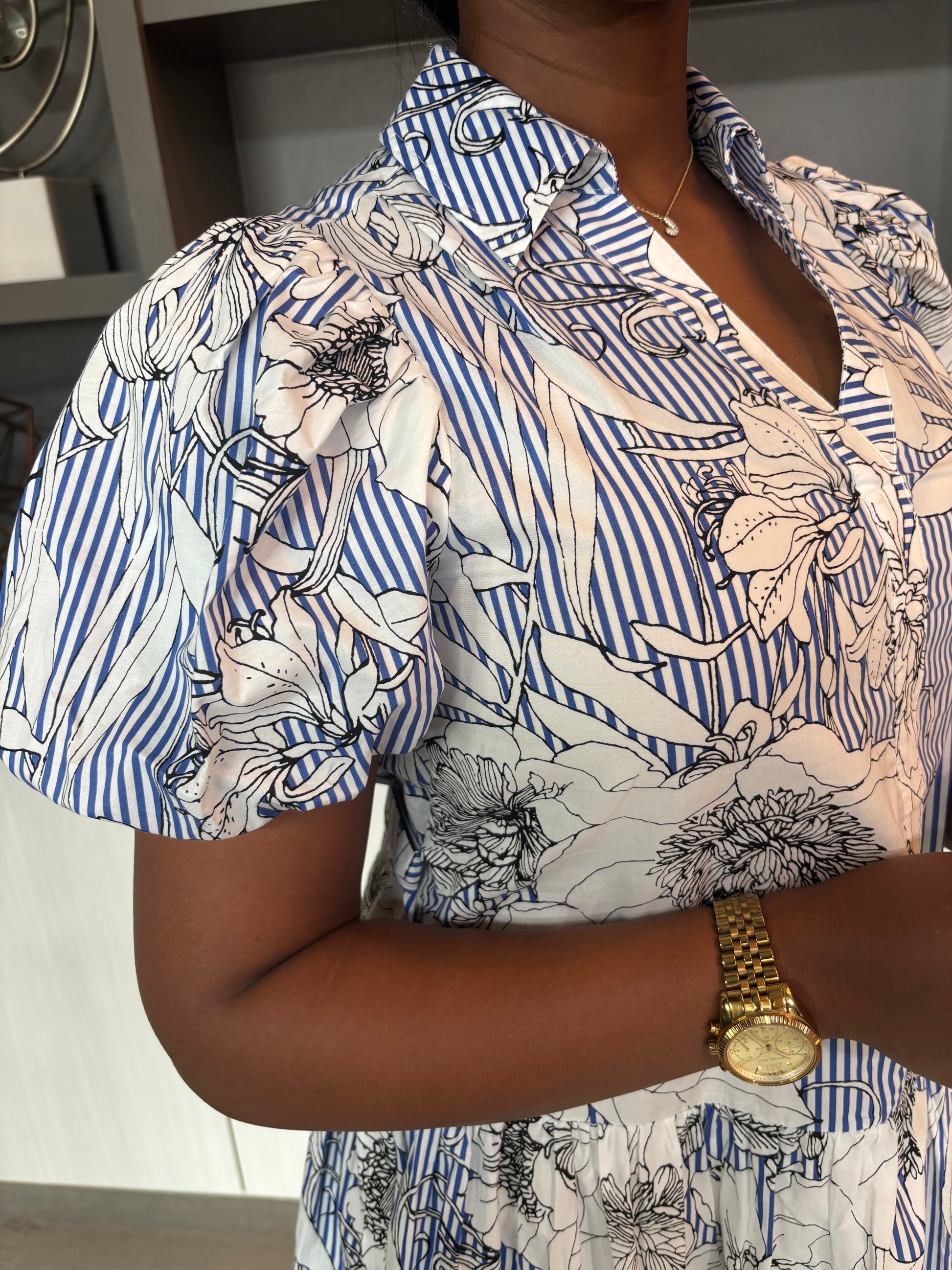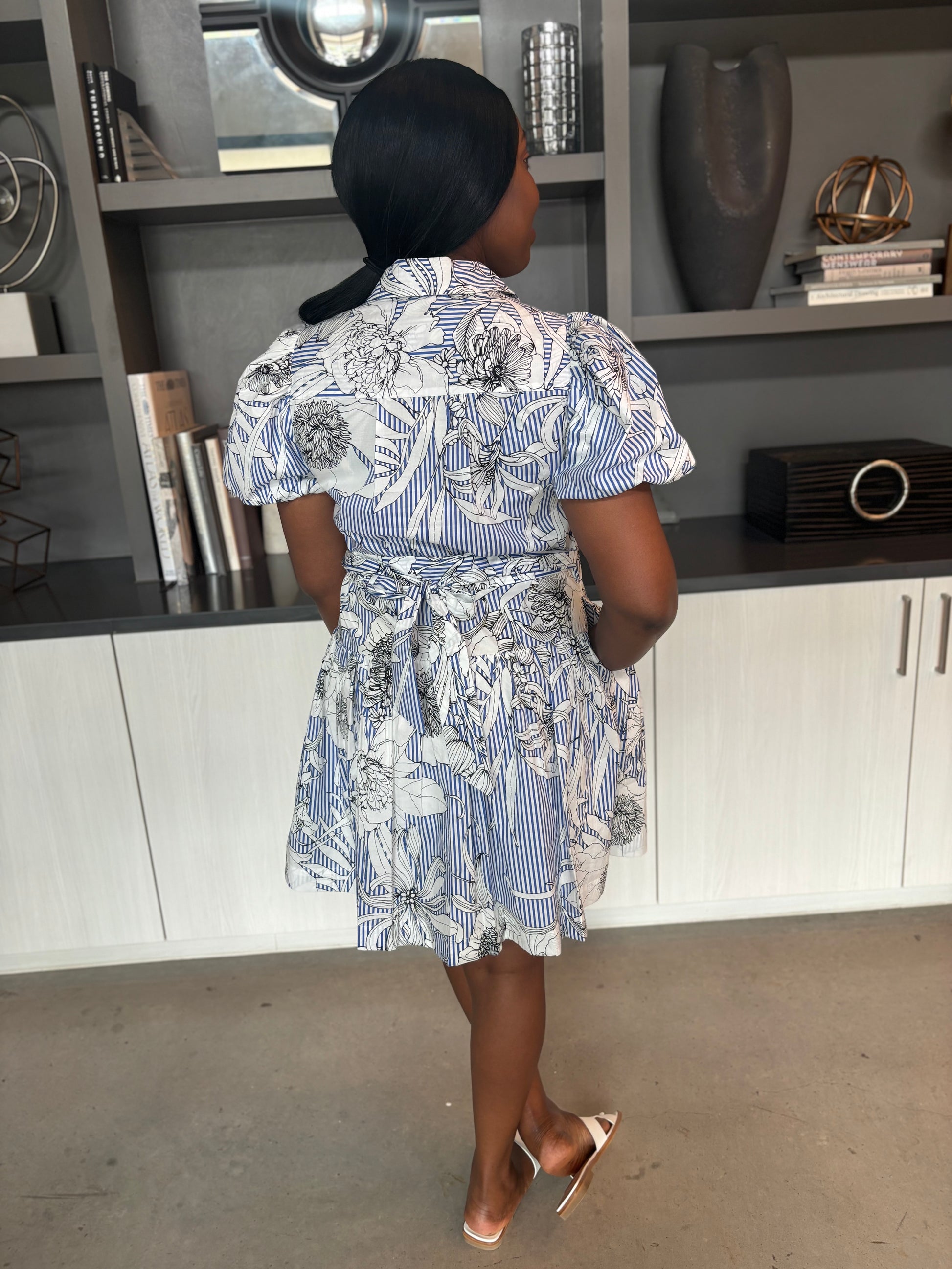 The Sketch Garden dress combines elegance and practicality with its delicate floral pattern, charming collar, and convenient pockets. Designed with elasticized sleeves for a comfortable fit, this short dress offers both style and ease for everyday wear.